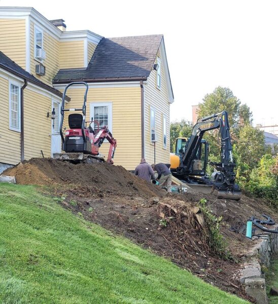Made possible by an anonymous donation and a grant from The Mcininch Foundation, the project represents the last phase of a moisture remediation project for AIM’s Ladd-Gilman House (1721) that began in 2019. “We have been able to connect the downspouts on the structure’s northerly side with an underground drainage system to the lower lawn event area behind Folsom Tavern,” said Rebeccah Seely, AIM Facilities Manager.